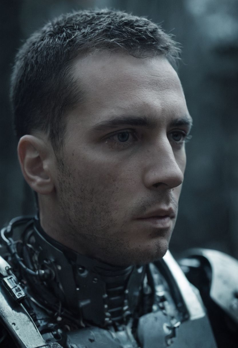 A war cinematic scene, portrait of war hero, DOF,F1.5, melancholic, haunting beauty. cyber man, half robot, realism.