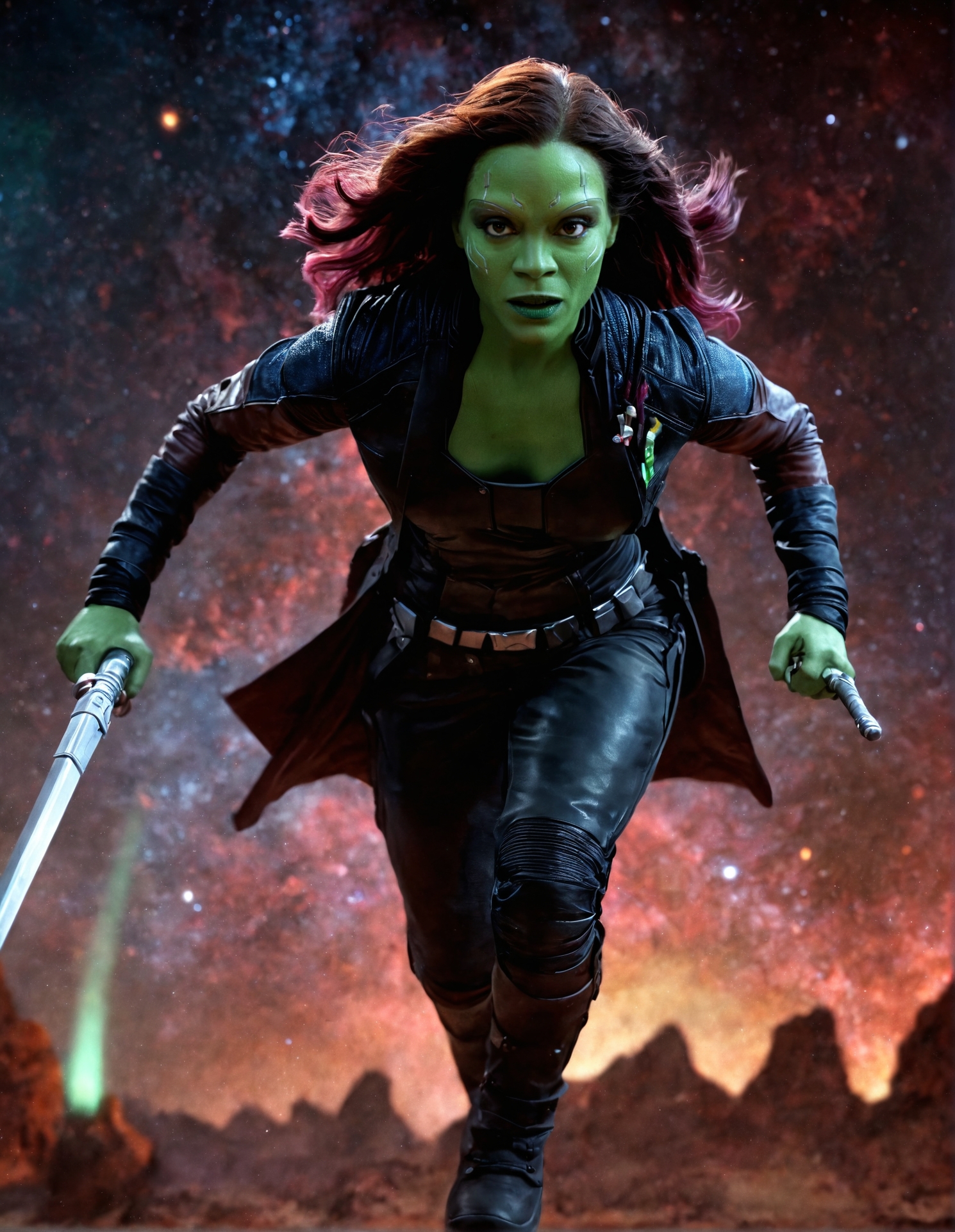 high resolution photo of gmra woman,full body shot,running,volumetric lighting,coat,vest,cinematic,film grain,realistic skin,pores,front view,depth of field,cosmic space background,holding a sword,front view,looking at viewer