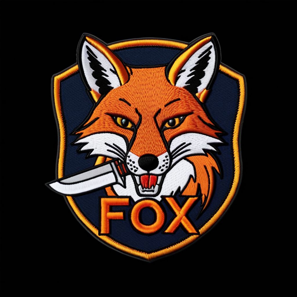 (fox holding 1 combat knife in mouth), (embroidery patch:1.2), detailed features, (combat knife), (embroidering:1.3), dark colors, (shield shape:1.1), clear outlines, flat background, (cartoon style:1.2), high-resolution, bold lines, serious, (adhesive backing:1.1), (custom design:1.1), the word 'FOX' at the bottom, bold text