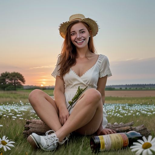 fantasy beautiful girl with beautiful blue eyes with long ginger isheveled hair and a straw hat soft lips with a beautiful smile, wearing a long black and white dress with white flowers with a neckline and short sleeves, wearing wedge shoes, holding a a bottle of wine in her hands, sitting on a fallen old tree in the middle of a meadow with tall grass, poppies and daisies, a brown sparrow is perched next to it, on a beautiful sunny day,sunset the evening is coming