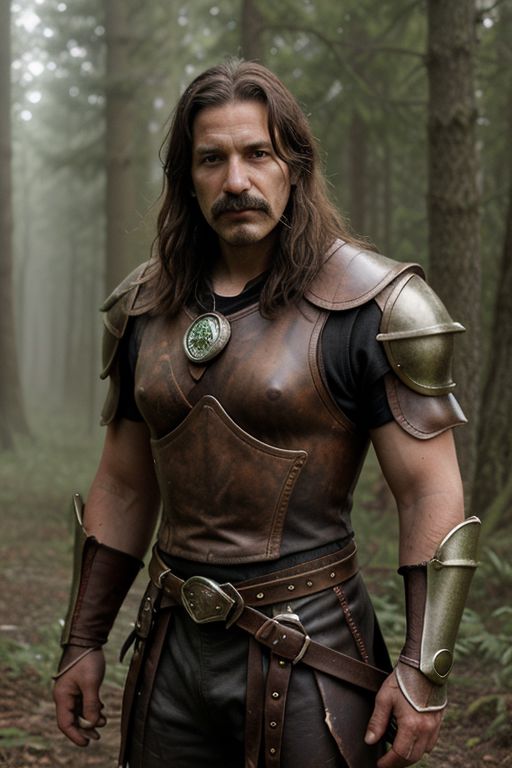 Hyper realistic and ultra detailed Photo of a manly D&D Ranger , Leather armour, Brown messy Hair, moustache, Forest Background