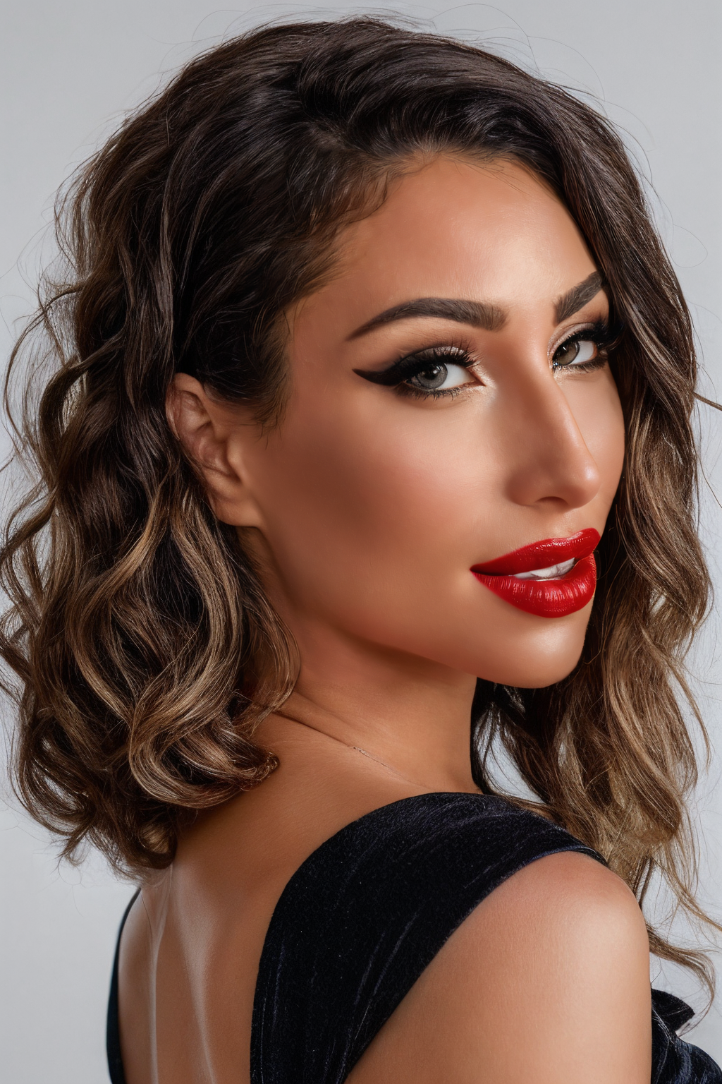 <lora:SC-Sarena_Banks:0.85>, photo of s4r3n4b4nk5, from side, smile, (modern photo), black dress, (plain Periwinkle background:1.2), 85mm, film grain, detailed eyes, red lipstick, looking back at viewer, (cinematic shot:1.3), epiCRealism, epiCPhoto, PA7_Portrait-HL_v2