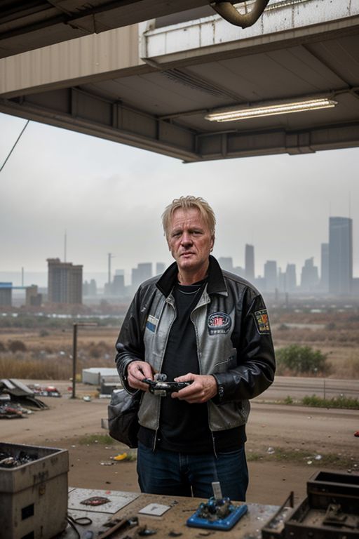 Robotics expert - Rutger Hauer look-alike,*Cyberpunk*, in The Sprawl - a future city of advanced technology and crime, artist (1guy) Henry spends his time making robots from scrap metal. workshop, inventor and half-finished robot, atmospheric.