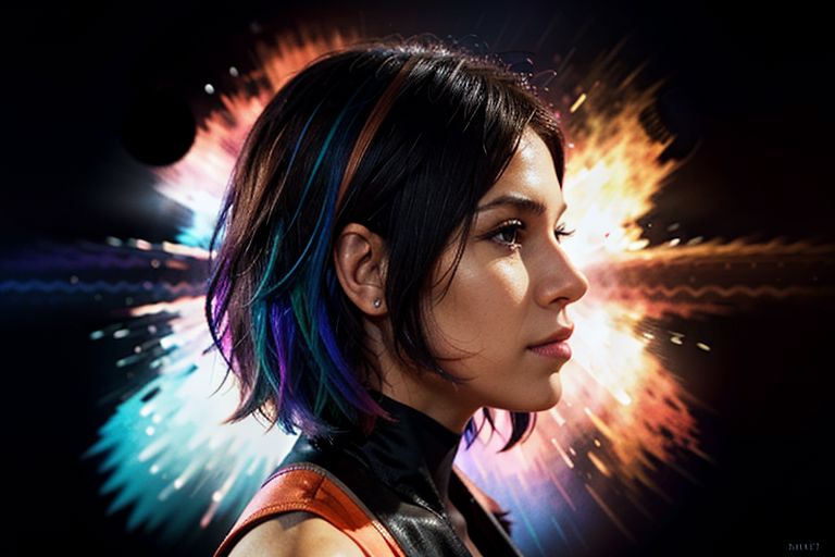 A vibrant digital artwork of a side profile portrait of a young woman with flowing hair. Her face should be illuminated, showcasing a calm and thoughtful expression. The background should be an explosion of abstract, colorful splashes and brush strokes, blending hues of blue, pink, purple, and orange. The colors should merge seamlessly with her hair, creating a dynamic and artistic fusion of elements. The overall atmosphere should be dreamlike and expressive, emphasizing the fluidity and motion of the colors as they blend with the subject's hair and face, Portrait