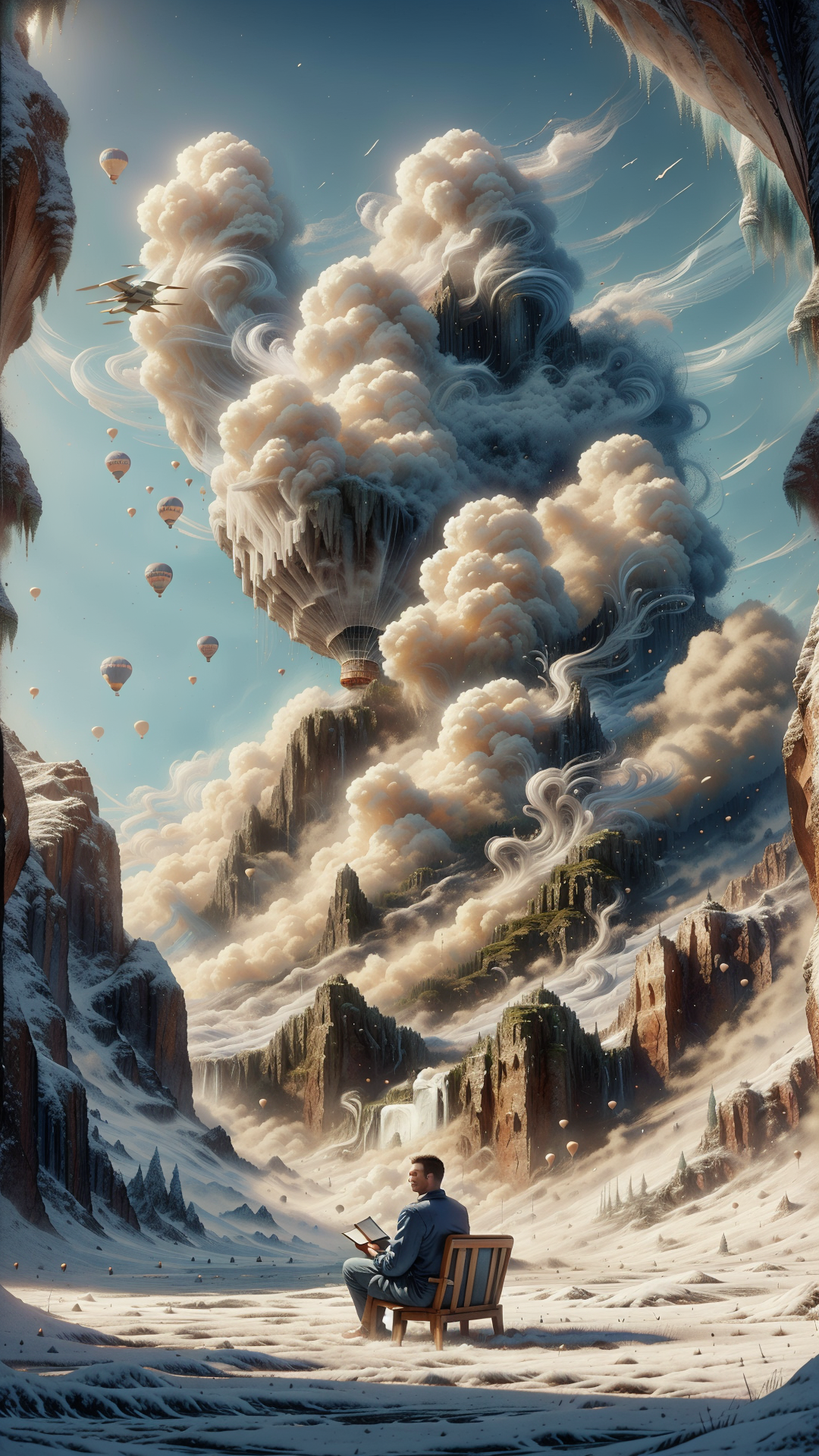 <lora:ElementWind:1.0> ElementWind a fair-skinned man with a warm smile reading a book in a sunlit room,Realistic, detailed painting of a frozen waterfall inside a cave, with a steampowered hot air balloon fleet passing by in the background, set in an ethereal floating city in the clouds, with a blue and white color scheme, icy textures, and bright, glowing lights, (Masterpiece:1.3) (best quality:1.2) (high quality:1.1)