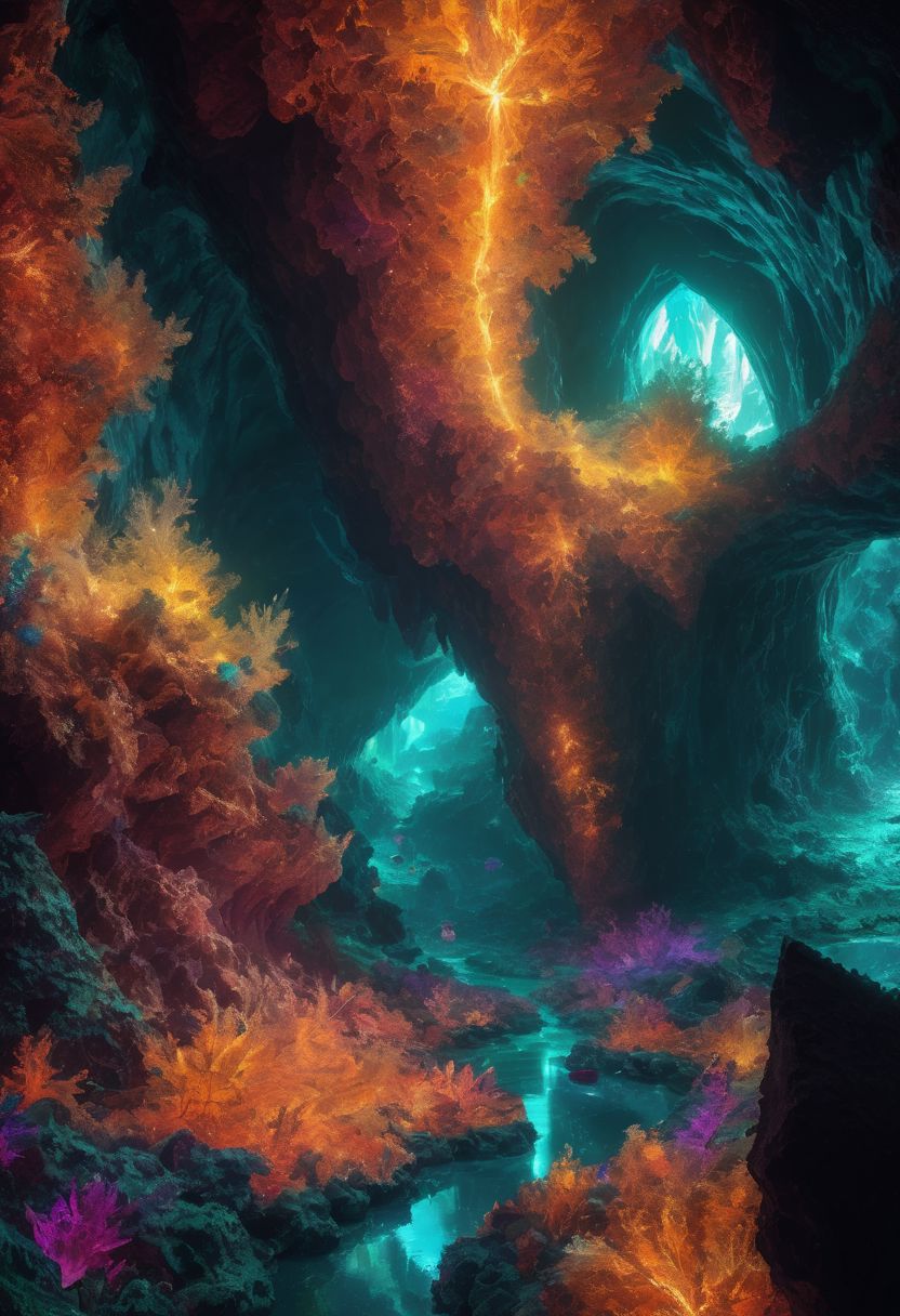 realistic, RAW,masterpiece, UHD, highly detailed,sharp image, extreme details, 8k resolution,OverallDetail,vibrant color, An underground realm with glowing crystals, subterranean rivers, fluorescent, Frac_XL