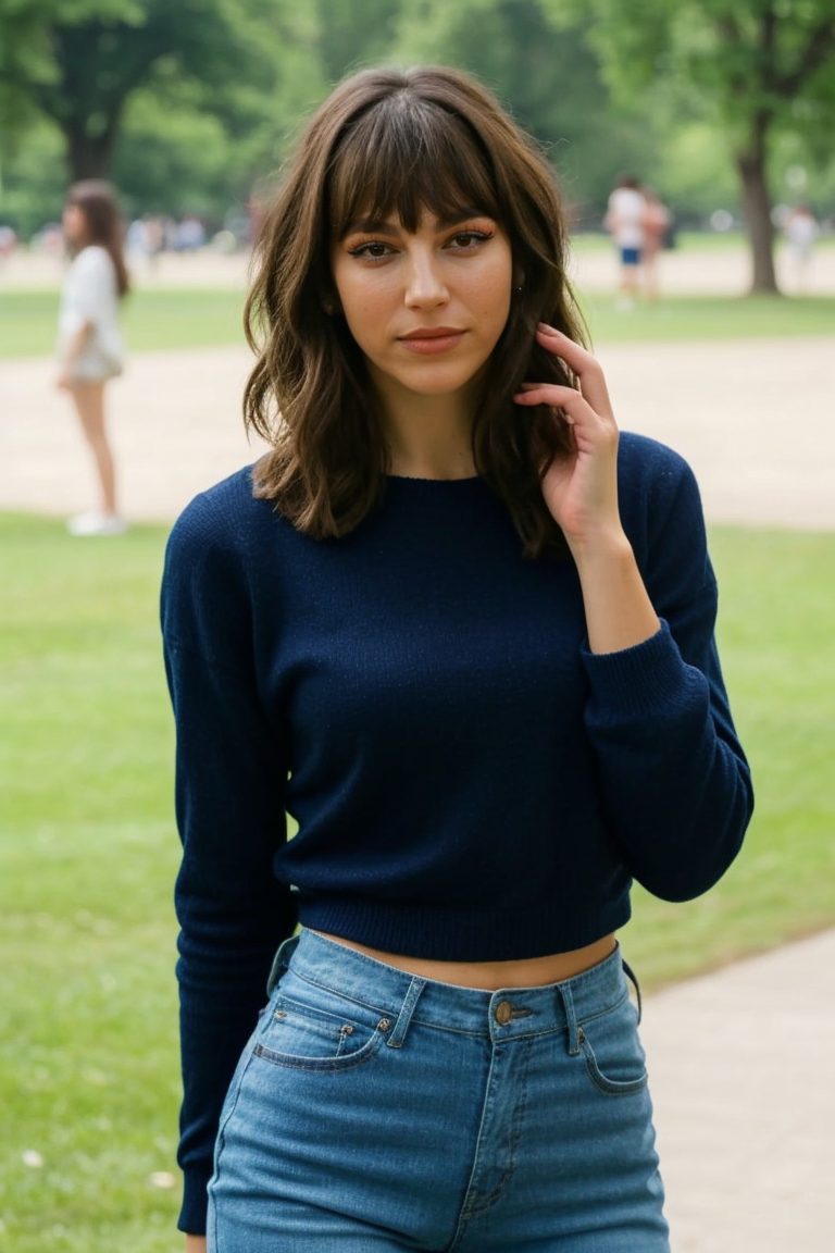 <lora:mondongo_LoRA_UrsulaCorbero:1> mndngwmn, bangs, wearing casual clothes, on the park