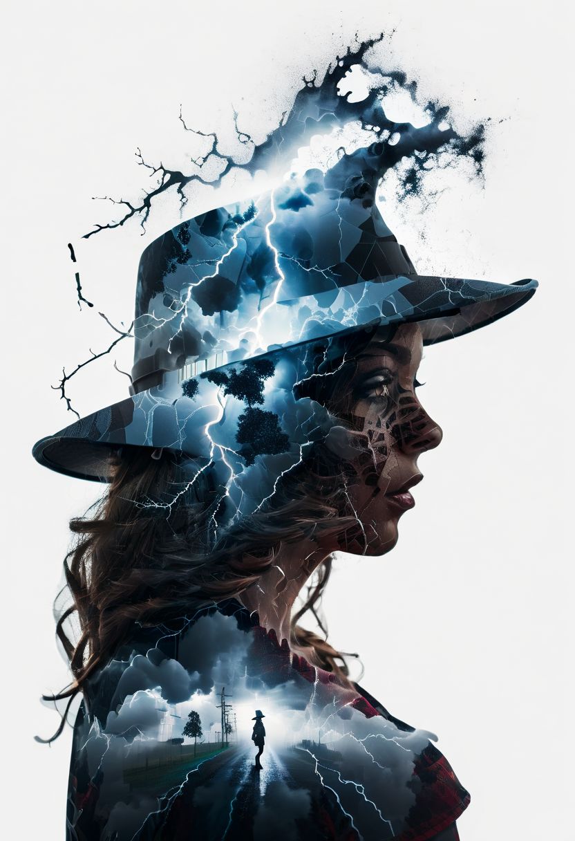 mysterious silhouette woman with hat, amazing depth, double exposure, surreal, thunder storm, pattern, lightening, geometric patterns, intricately detailed, bokeh, perfect balanced, deep fine borders, artistic photorealism , smooth, with a white background