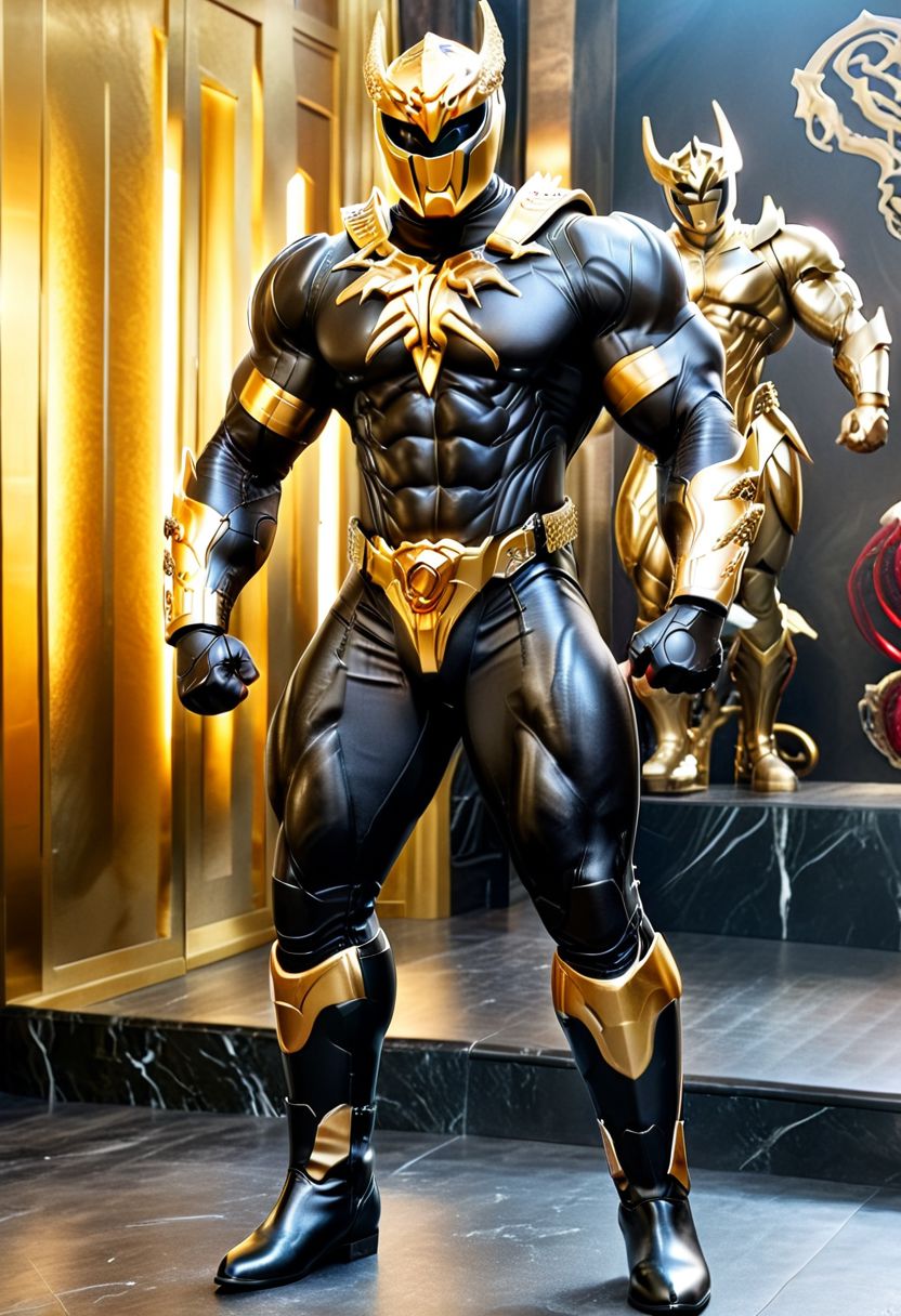 ((Standing flexing poses in elegant mansion:1.8)) (((full body view:1.9))). ((Heavily massive muscular man with massive hypermuscle biceps:1.3)) wearing (((smooth futuristic Power Rangers Lord Drakkon helmet with high tech visor with gold dragon accents and gold dragon horns and completely covers face and mouth with massive hypermuscle biceps:1.8) and ((((black tight bulging biceps patent full body black chic leather undersuit with large golden broad collar armor with golden dragon shoulder armor covers whole body with massive hyper muscle biceps:1.9)))) and (((black black leather superhero gloves, black tight motorcyclist patent leg black leather pants with golden accents with gold power rangers Morpher belt with black power rangers boots:1.9))), ((masterpiece, fine details, breathtaking realistic photo style, full body portrait, high quality, 8k, very detailed, high resolution, exquisite composition and lighting, soft focus, depth of field, 8k photo, HDR, professional lighting: 1.8)) ((photorealistic:1.8))