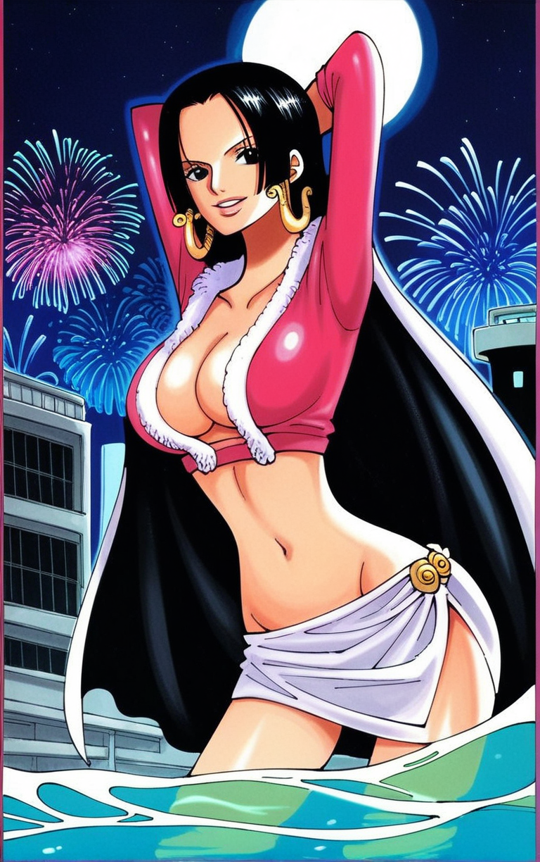 score_9, score_8_up, score_7_up, looking at viewer, BREAK source_anime, ARTSTYLE_OnePiece_MangaColored_ownwaifu, 1girl, boa hancock, large breasts, long hair, black hair, jewelry, earrings, midriff, cape, cleavage, long legs, navel, side slit, crop top, no bra, black eyes, groin, (contrapposto, arms behind head, aerial fireworks), wading, neon_lights, cityscape, night, pool, full moon, outdoors, <lora:PONYXL_OnePiece_MangaColored_ownwaifu:0.9> , depth of field, solo,