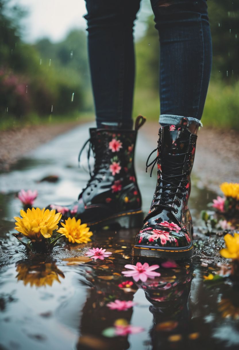 extreme closeup photo of a woman wearing Doc Martens style boots with flower prints splashing in a puddle, (extreme focus on the boots:1.2), sunshine after the rain, shallow depth of field, highly detailed