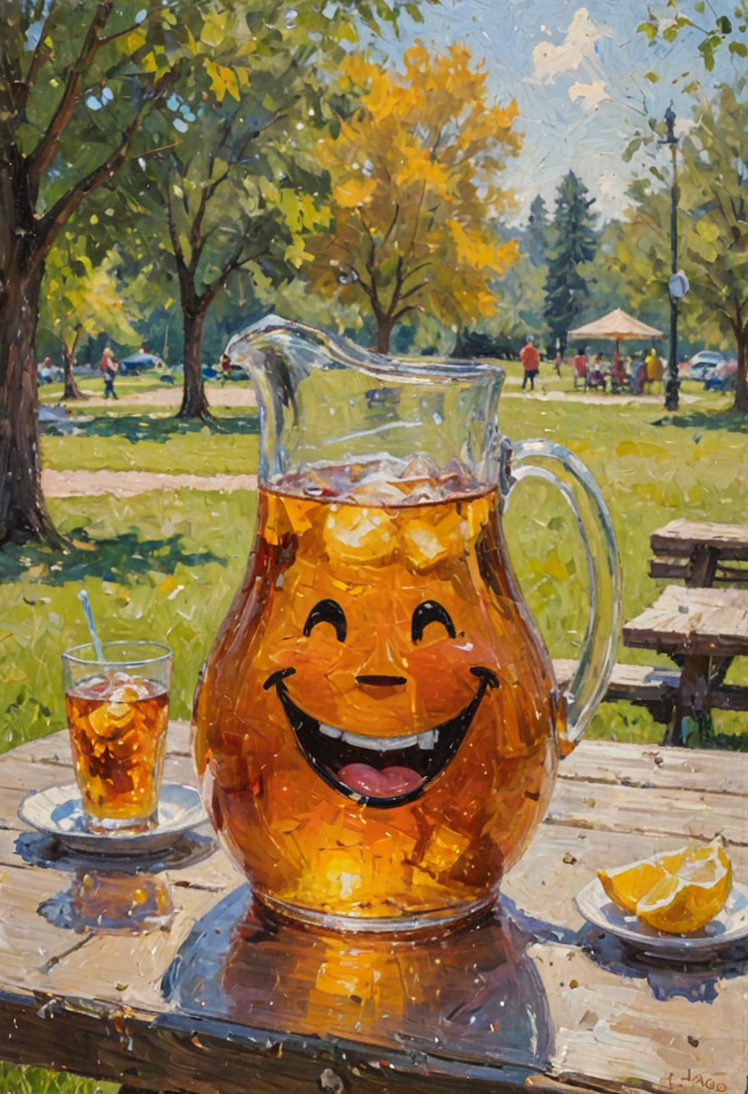 impressionist painting, still life of a pitcher of ice tea with a mouth, smiling, huge grin, on a picnic table, outside, park, day, <lora:EldritchImpressionismXL1.5:0.4> <lora:Pollock_2.0:0.3>