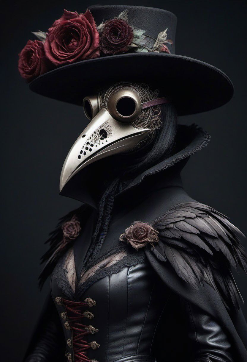 Insanely detailed CG wallpaper, 16k, a girl cosplaying a plague doctor, insanely realistic and ornate outfit, a hat decorated with dry roses and raven feathers, half-body shot, anatomically correct female torso, (photographed by lee jeffries), trending on guweiz