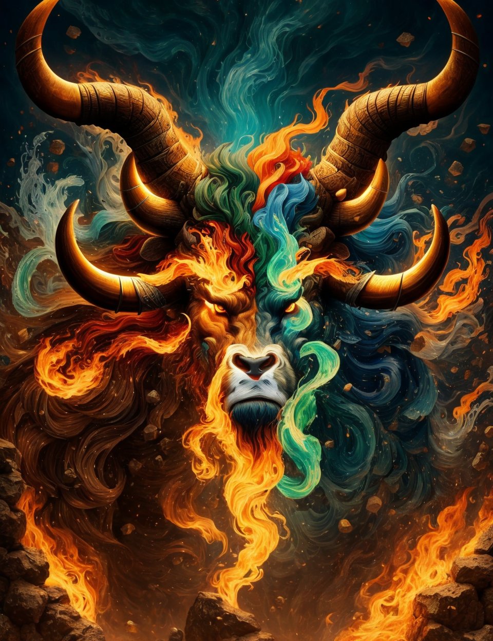 DonMM4573r0f3l3, minotaur, mythical creature with the head of a bull and the body of a man, greek mythology, fierce and monstrous, chaos, primal instinct, fantasy , <lora:DonMM4573r0f3l3:0.8>
