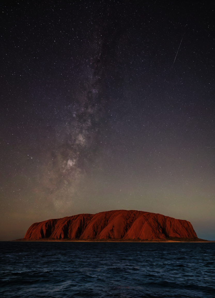 Ayers Rock completely surrounded by ocean. Surf pounds the walls of rock. Night sky full of stars. Wide angle. High shot, tilted up, low horizon