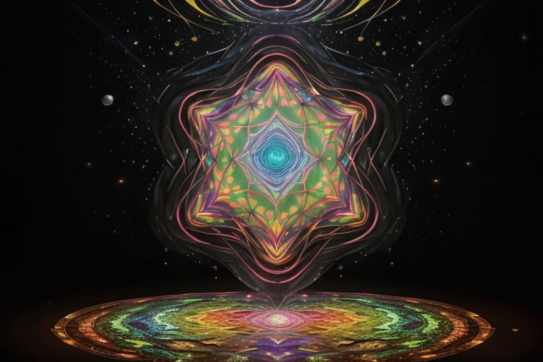 "Imagine a vivid, dynamic scene featuring complex, colorful geometric patterns. The setting is an infinite space filled with interlocking triangles, hexagons, and circles, each pulsating with vibrant colors like reds, blues, greens, and yellows. The geometric shapes are in constant transformation, shifting seamlessly from triangles to hexagons, to eight-pointed stars, and spirals. Each shape is outlined with shimmering, rainbow-like light, creating a glowing halo effect. Golden lines trace additional patterns, adding a three-dimensional depth to the scene. The entire pattern breathes, expanding and contracting rhythmically. Occasionally, humanoid figures and mythical animals emerge from the patterns, weaving fleeting stories before merging back into the geometric tapestry. The overall image is a mesmerizing dance of geometry and light, inviting the viewer into a hypnotic, otherworldly experience."