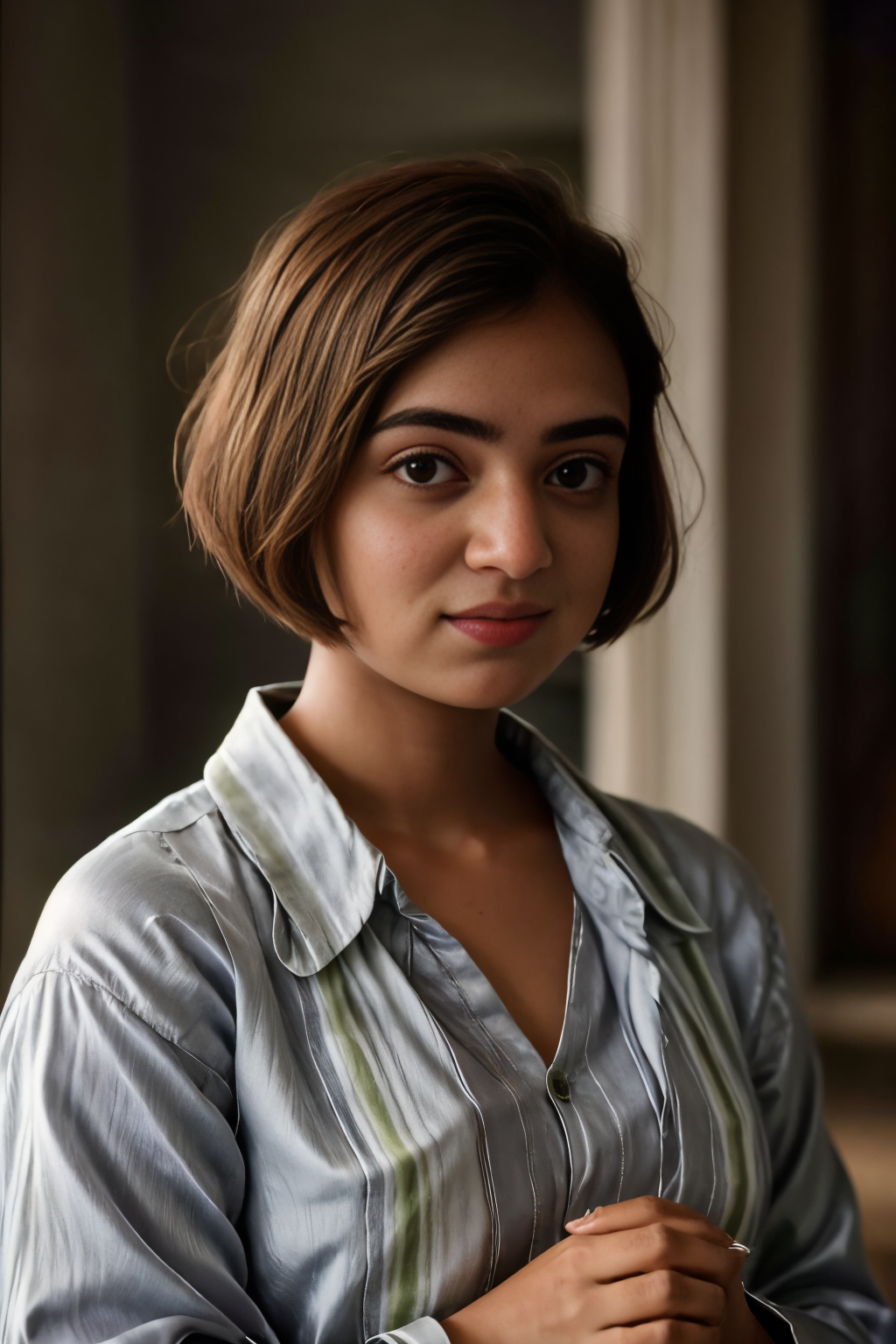NazriyaNazim, art by Mary Anning, portrait,close up of a Pictorial Girl, Gray Bowl cut hairstyle, inside of a Satin University, Classical Realism, CineColor, <lora:NazriyaNazimSD1.5:1>