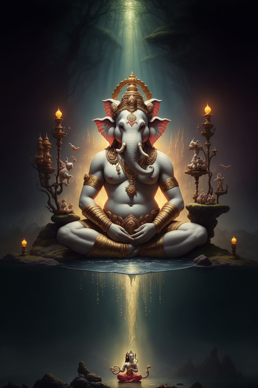 ((best quality)), ((masterpiece)), ((realistic)), Ganesh immersed in a fabulous world of fantasy, set in an enchanting and magical environment. The scene should be illuminated by a soft, ethereal glow. The artwork should be created in the style of J.R.R. Tolkien, using watercolor as the medium. The color scheme should be vibrant, featuring a mix of warm and cool tones. It should be a high-definition illustration. on eye level, scenic, masterpiece.