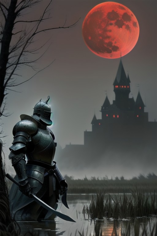 RAW photo, (masterpiece:1.3), subsurface scattering, heavy shadow, (high quality:1.4), (intricate, high detail:1.2), professional photography, HDR, High Dynamic Range, realistic, ultra realistic, photorealistic, high resolution, film photography, ambient lighting, atmospheric effects, <lora:detail_slider_v4:2>, OverallDetail, DarkFantasy, 1 male (knight), in creepy swamp surrounded by reeds, full armor, evil eyes, holding broadsword, castle in the background, red moon, dead trees, mossy water,