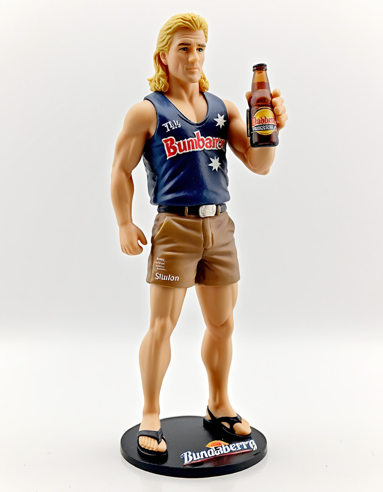 <lora:FigureXL:1> ((plastic, resin figurine, action figure, a plastic figurine)) of a slim, muscular, australian man, named bruce, tanned, blonde mullet, aged 42, broad shoulders, holding a bottle of bundaberg , confused expression, , (queensland state of origin jersey) (khaki stubby shorts) ( wearing flip-flips), <lora:add-detail-xl:2>
