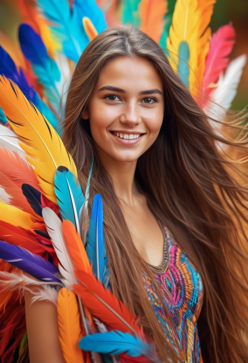 young woman with long hair, hyperspace of bright colors in background, gentle smile, body covered with colorful bird feathers , strong wind, soft focus, full body, realistic photo, vivid colors, OverallDetailXL,