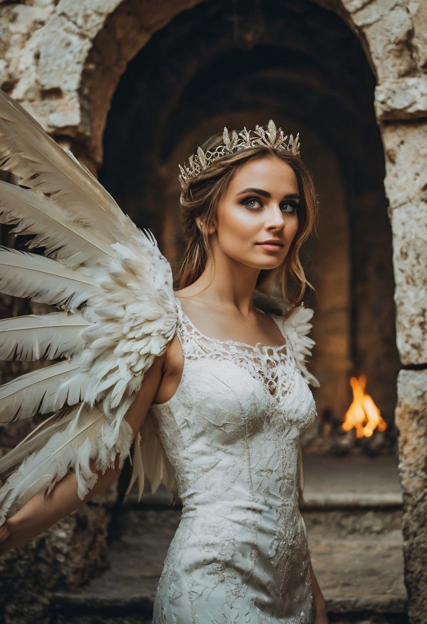 professional photography. Cinematic. The details are amazing.1 amazing woman-angel from paradise in human form. The angel is a human being. anthropomorphic. a beautiful face. white skin. feathers. oval pupils. golden. big eyes.breast. a strong body with wings. cheerful. inside an ancient stone tower. the background. sound lighting. flame. glare. An atmosphere of fear, amazing depth of field, stunning extensive details, natural ambient lighting