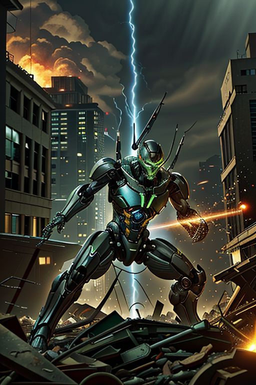 a (giant war robot with iron muscles, color wires and transparent panels and led lights) BREAK wearing a (cybernetic armor) with sharp spikes, combat pose BREAK rampaging in a (large city), destroyed buildings and (atomic explosions), piles of rubble on fire BREAK in a storm night with thunders in the distance BREAK photo realistic, 24mm, dolly zoom, dutch angle, cinematic look, lens flare, sharp focus, intrincate details, volumetric light