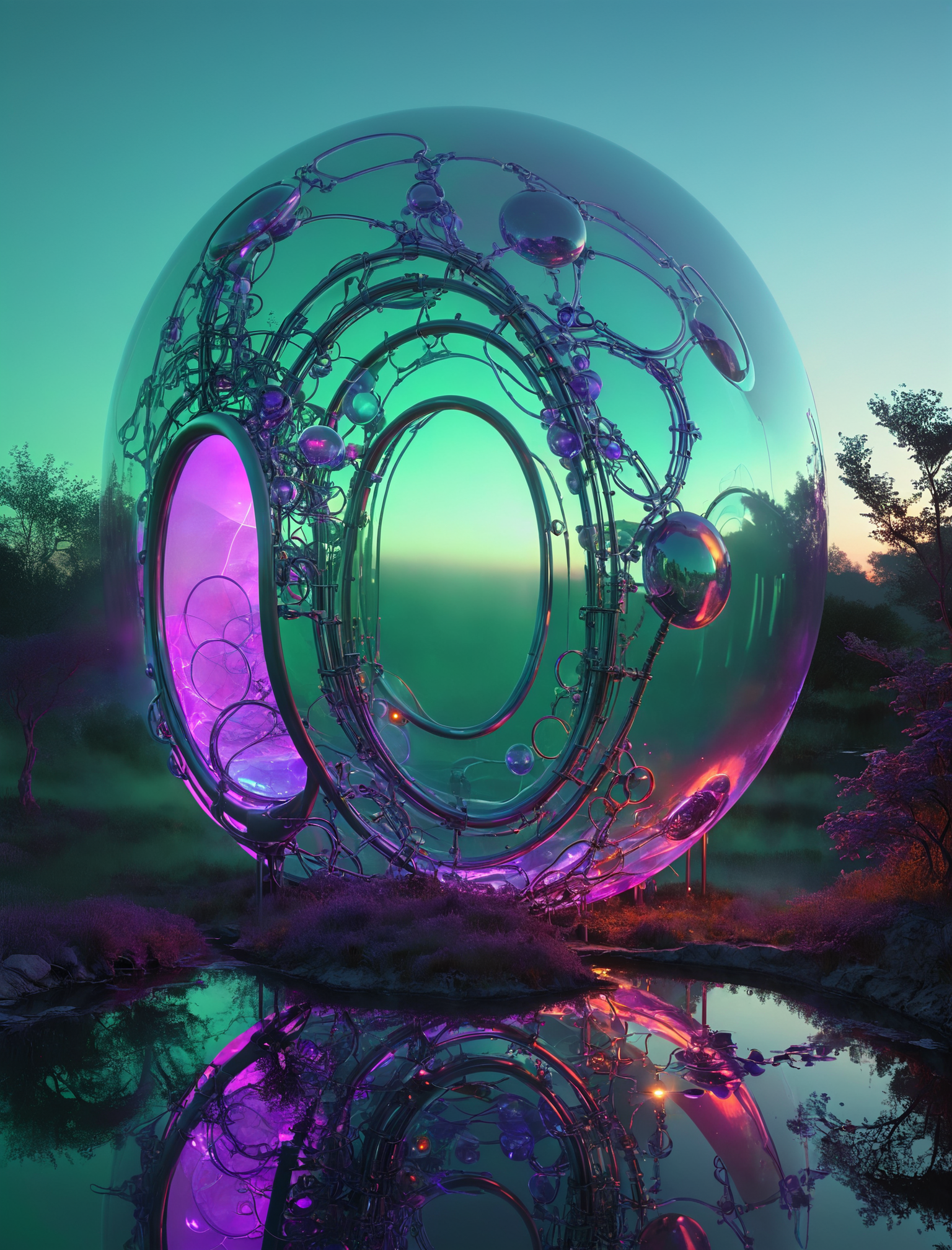 bio-mechscape luminarium, organic machines in a twilight haze, hybrid symphonies, tangled neural networks, radiant emerald and violet, a Futuristic guardian encircled by rings, deep in reflection, By Moebius