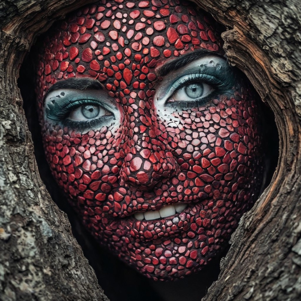 photo of a amazing stones skin fractals Russian, beautiful face.37 years. Smiles. unaware of camera, subtle make-up, red wood cosplay clothing, braless, naturally curvy, naturally sexy, high detail, close-up, 32k UHD, cinematic photography, amazing detail, soft focus, full-length editorial shot, depth of field, supernatural, incredibly complex overdetalization, amazing depth, extensive details, add detail xl