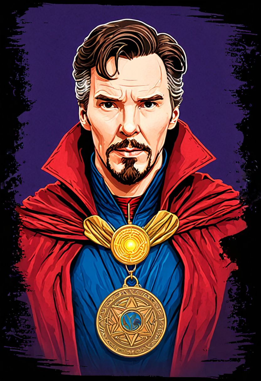 a man with a medal around his neck, vector art, inspired by Chip Zdarsky, doctor strange, super hero mask, full protrait, with cape, portrait of benedict cumberbatch, goatee, your personal data avatar, profile shot, vector graphics with clean lines, magician,a man with a medal around his neck, walter white as doctor strange, mascot illustration, flat minimalistic, face and skin is dark red, orb of agamento, shapeshifter, the magician, scarlet witch, dd, test<lora:Nerdrawing_geek_drawing_style:1>