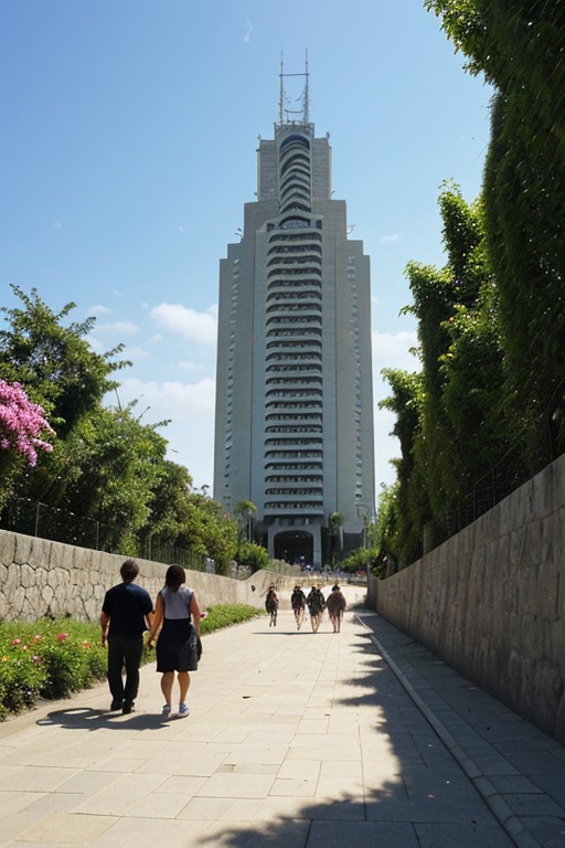 It's a sunny day, Blue sky [A "luxurious modern White tower (skyscraper) with elegant design, tall, with a slight turn on its axis, it has a triangular or honeycomb-type parametric structure with a slightly curved shape." You can see the imposing tower with people walking, there are many trees with a lot of flowers pink and purple. The context is a cliff near the sea, you can see a path with people leading to the sea, Barranco - Lima - Perú].