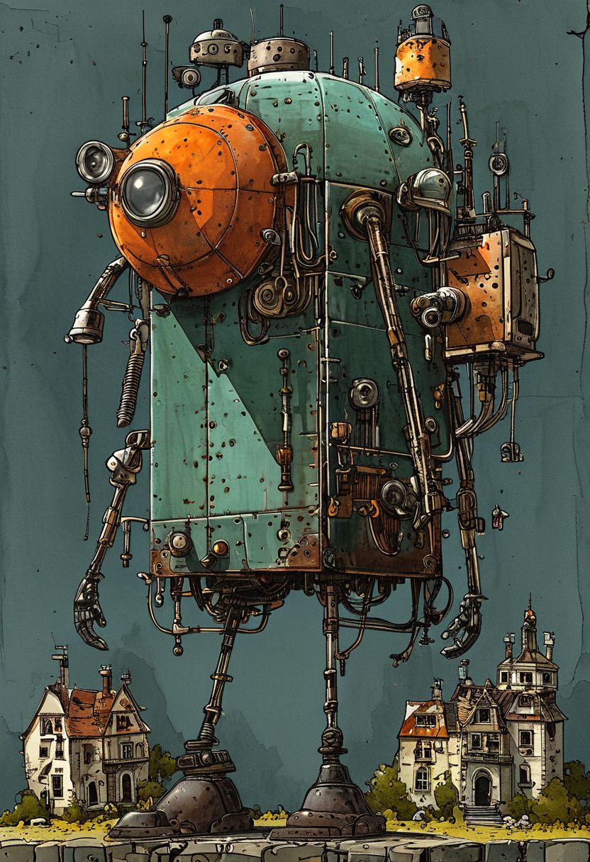 (illustration) mechanical, animatronic, rust, junk, cluttered <lora:tbh147-sdxl:0.8>. dark and moody, a mesmerizing blend of light and shadow. masterpiece, absurdres, intricate details