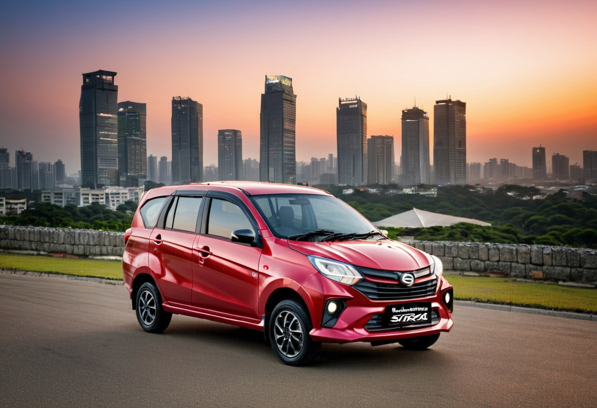 high resolution, best quality, Car, Daihatsu Sigra, Cityscape, dusk, skyscrapers,
