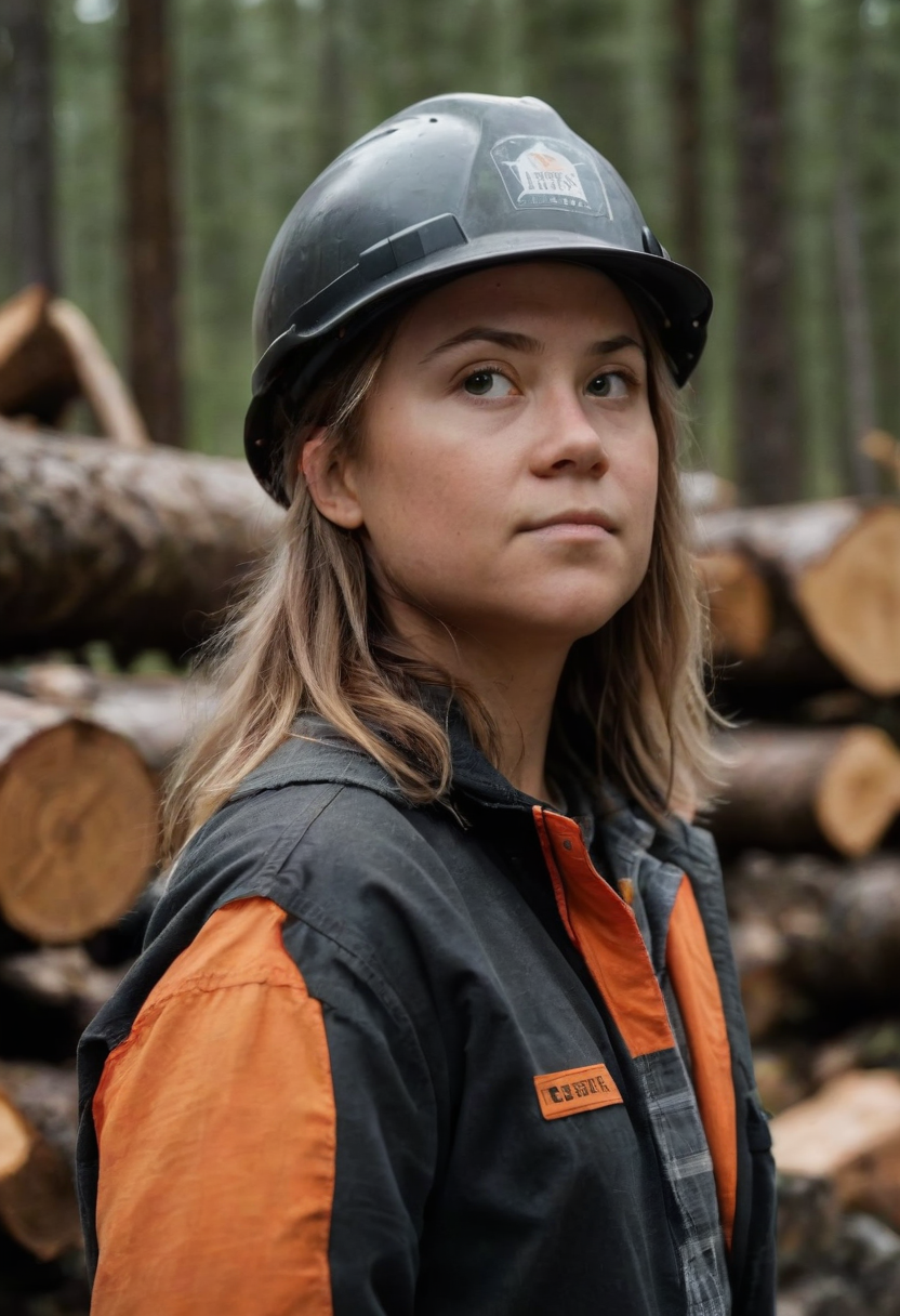 greta is a logger working in Alaska,wearing loggers safety gear,looking away,Cinematic,high quality photography,4k textures,8k resolution,Canon EOS R3,<lora:greta:0.9>,