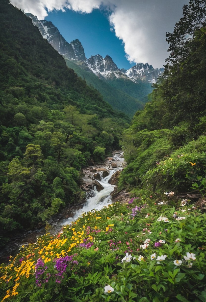 The scene captured by the Sony A7IV with a 20mm G Master lens set at a wide aperture of F1.5 unfolds with haunting beauty, enveloped in a moody and melancholic atmosphere., The distinctive characteristics of the Barun Valley manifest as a juxtaposition of elements, where tall waterfalls cascade into deep ravines, rugged rocks emerge from vibrant, verdant forests, and a variety of colorful flowers blossom against the backdrop of snow-covered peaks.