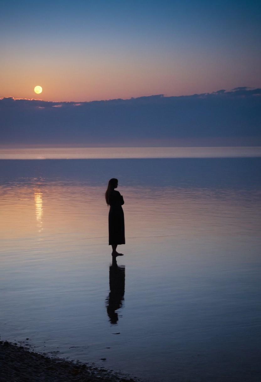As twilight descends, a woman stands on the shore, her silhouette softly defined by the moon's gentle embrace. The striking detail of her gentle blur adds a layer of calm, as if she were a reflection of the ocean's serenity. The focus rests on the distant horizon, where the moon, a glowing sentinel, rises majestically over the peaceful waters. The backlit sky, a harmonious blend of deep blues and silver hues, accentuates the tranquil beauty of this twilight scene, inviting a sense of peaceful contemplation.