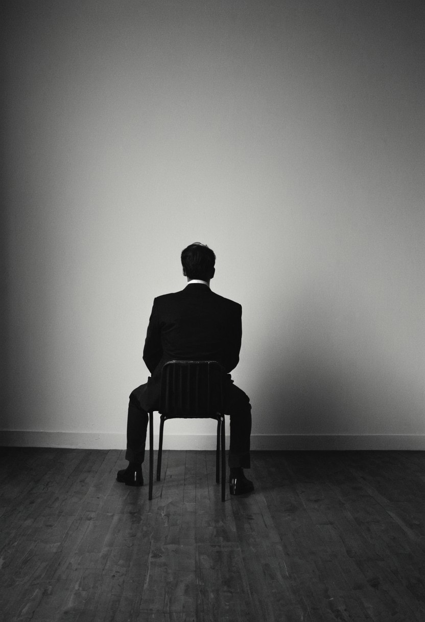 A lonely man sitting on a chair, negative space, empty image ethereal photography. a rough paper filter. cross processing. moody , melancholic, gloomy. black and white,