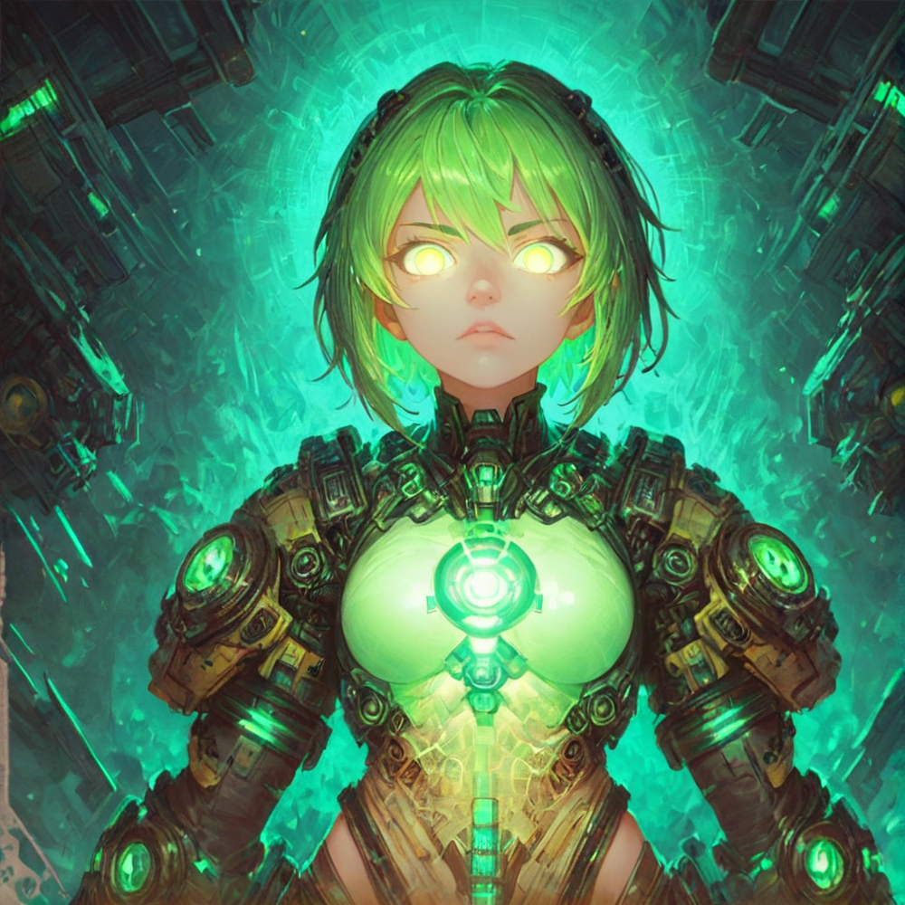score_9, score_8_up, score_7_up, <lora:nuclearhazard_Pony:0.8>nuclearhazard, girl,solo,,see-trought clothes,glowing eyes,short glowing bright green hair,front view,simetric,eye focus