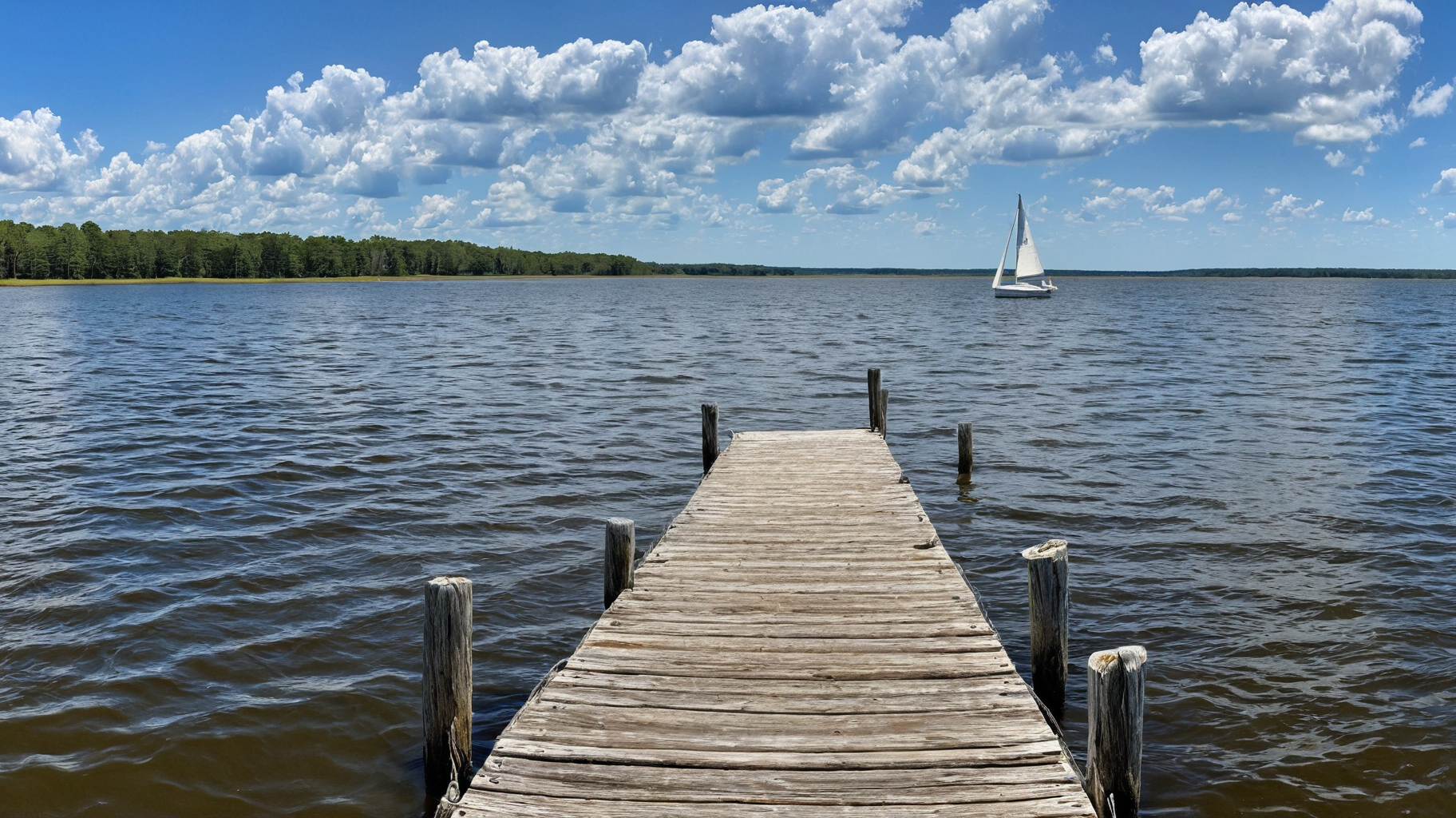 Virginia Eastern Shore, tidal river, summer, hot, old wooden dock reaching out into the water, highest quality, professional photography, extremely detailed, realistic, on land looking at pier, sailboat under sail in the distance,