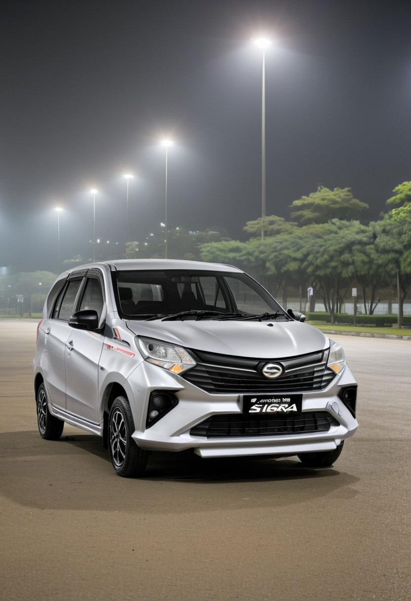 high resolution, best quality, Car, Daihatsu Sigra, Night, empty parking lot, single street lamp,