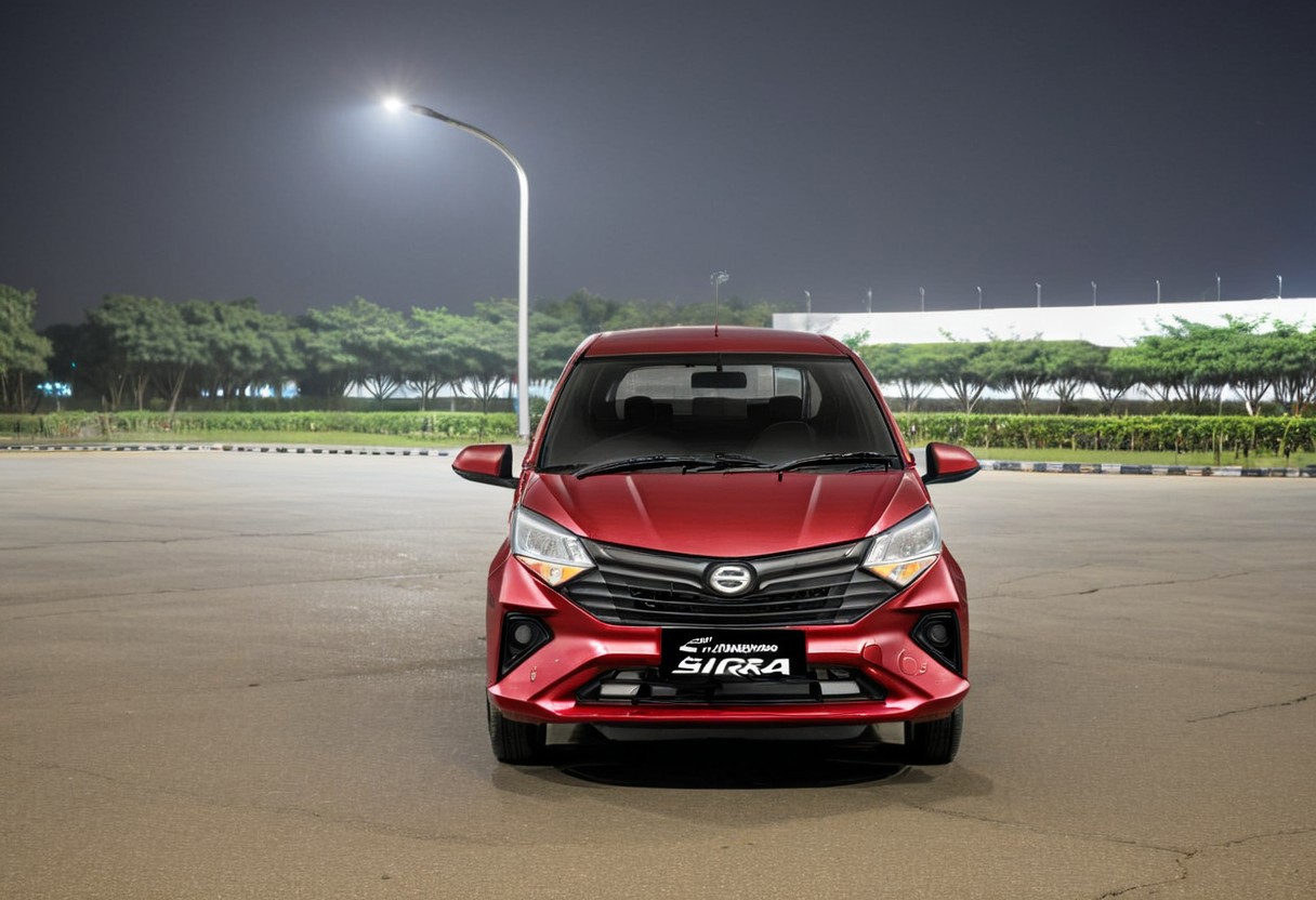high resolution, best quality, Car, Daihatsu Sigra, Night, empty parking lot, single street lamp,