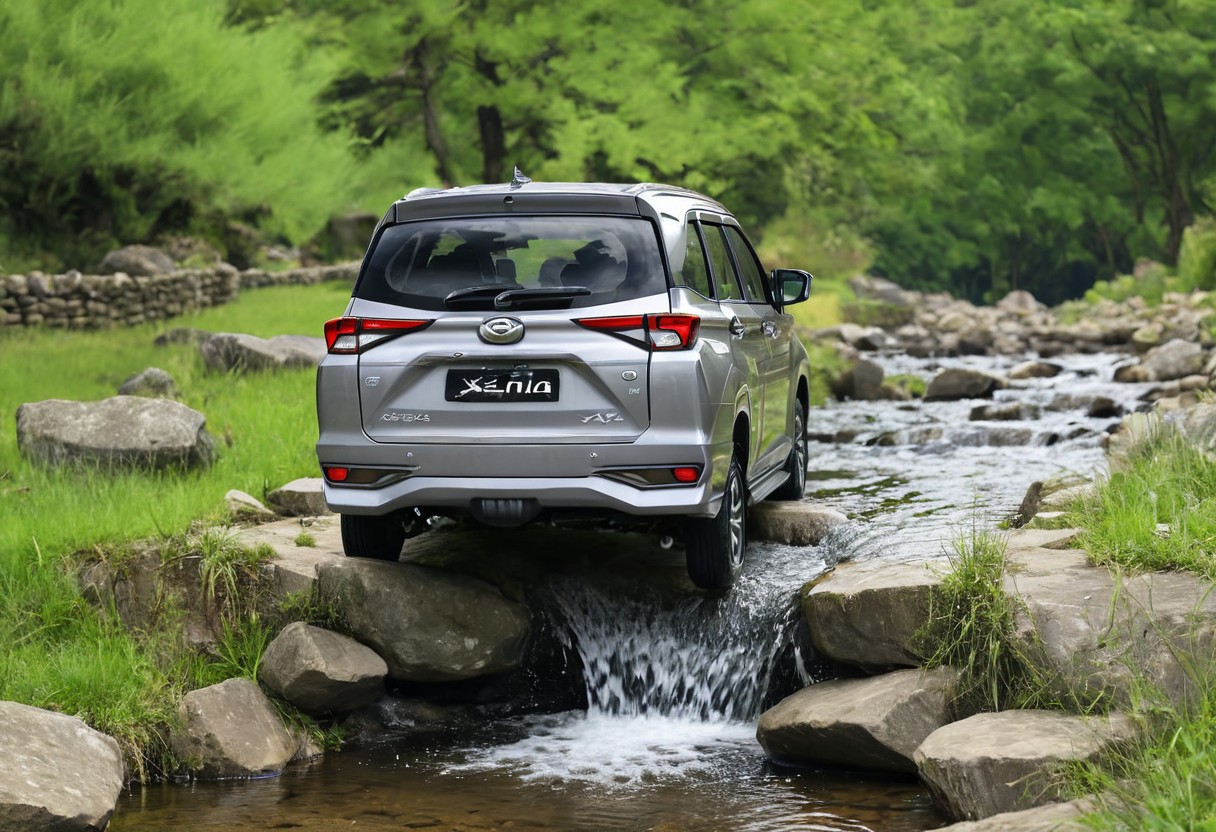 high resolution, best quality, Car, Daihatsu Xenia, Countryside, stone bridge, clear stream,