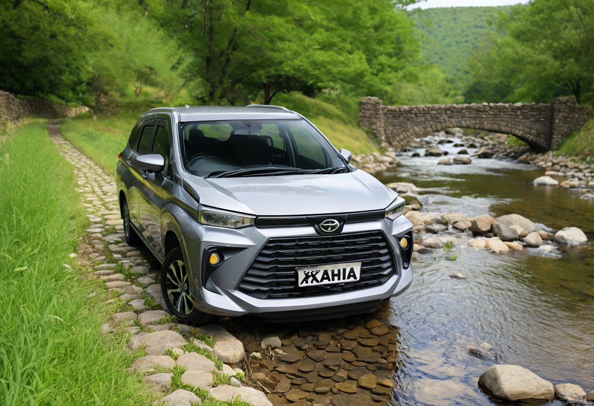 high resolution, best quality, Car, Daihatsu Xenia, Countryside, stone bridge, clear stream,