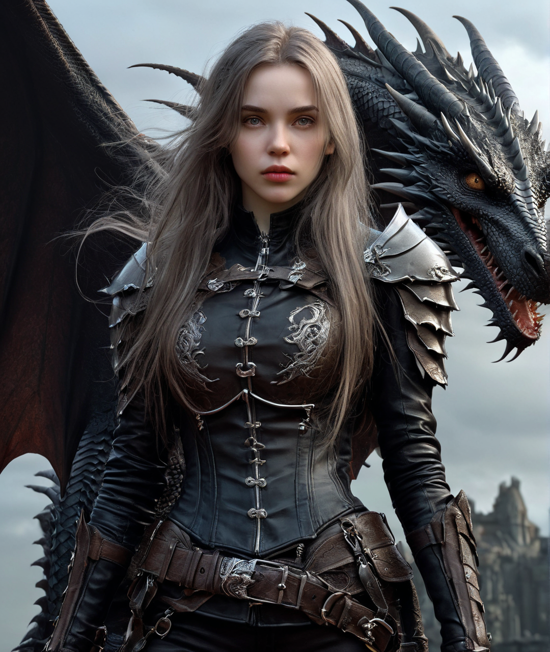 1girl, petite young woman, long brown silver hair, pale skin, pale eyes, black leather armor, daggers strapped to her chest, dragon rider, dark fantasy, cinematic, dark fantasy Photorealistic, hyperdetailed, dark, dark art by Jean Baptiste Monge, Alberto Seveso, Jeremy Mann,