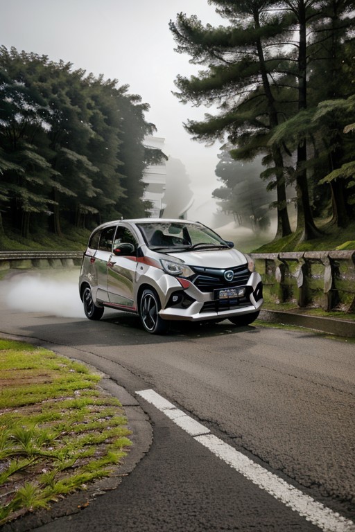 high resolution, best quality, Car, Daihatsu Sigra, Foggy morning, dense forest, winding path,