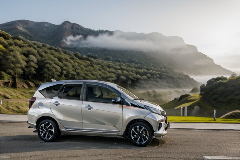 high resolution, best quality, Car, Daihatsu Sigra, Foggy mountain, early morning, remote,