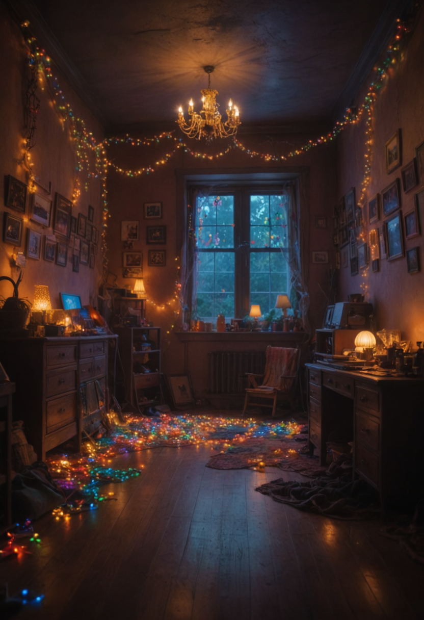 vibrant scene, room filled with colorful lights, glowing softly, scattered throughout, dimly lit, illuminating, perspective, distortion, warmth, artistic, dreamy, tranquility, <lora:RMSDXL_Enhance:4>