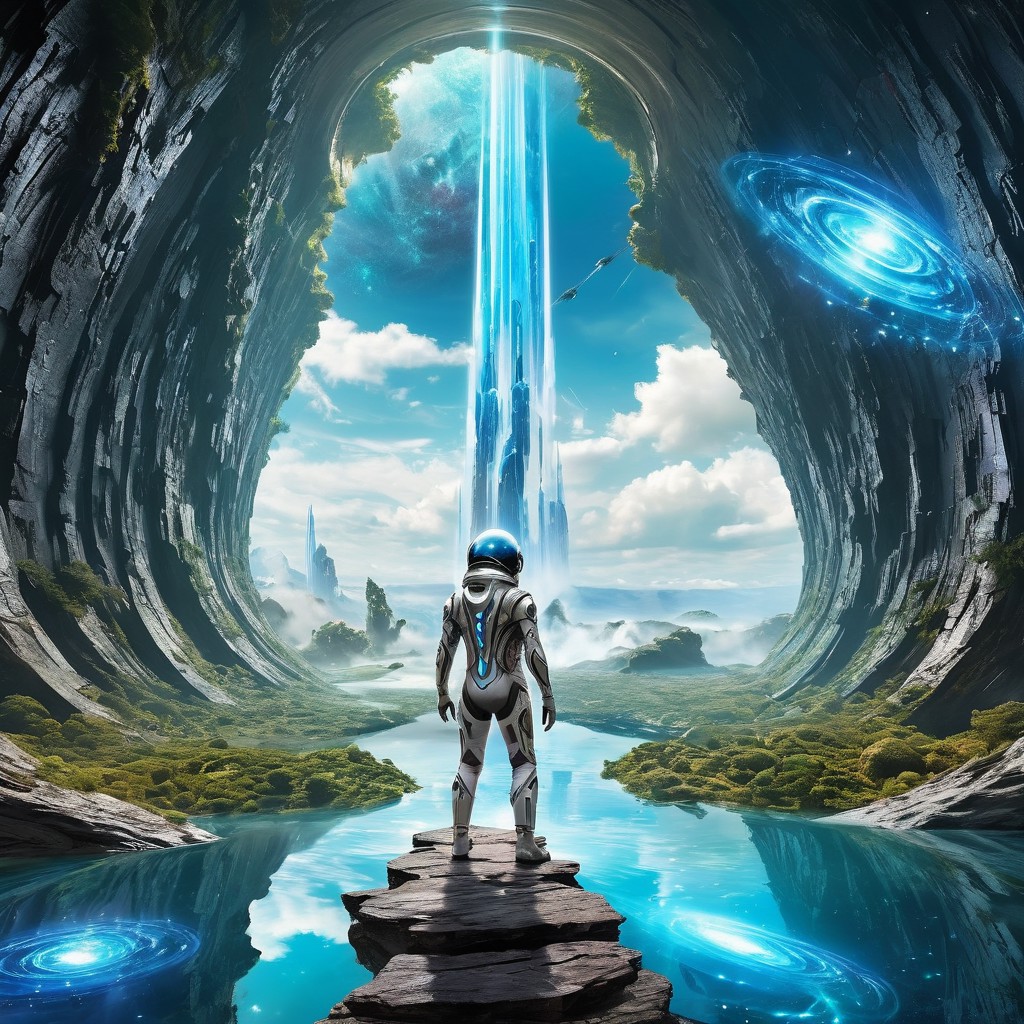 A daring explorer in a futuristic suit steps through a shimmering interdimensional portal. On the other side, a surreal landscape unfolds, with floating islands, upside-down waterfalls, and a sky filled with swirling galaxies.