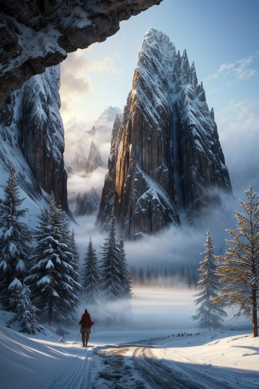masterpiece, best quality, absurdres, illustration, photorealistic, towering peaks, snow-capped, ancient ruins, mist, glowing runes, mythical creatures