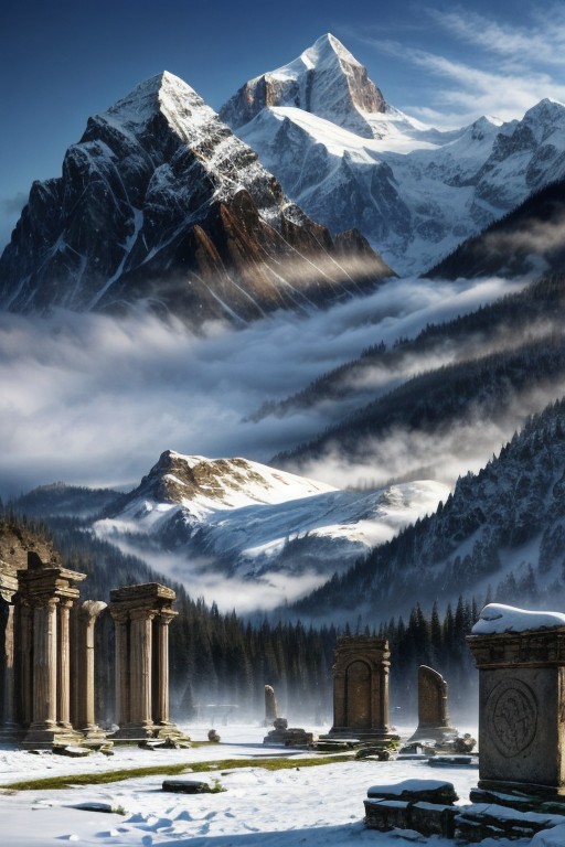 masterpiece, best quality, absurdres, illustration, photorealistic, towering peaks, snow-capped, ancient ruins, mist, glowing runes, mythical creatures